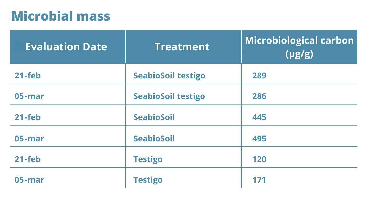 Results show that SeabioSOIL® raised the microbial biomass to an “Excellent” level of 495 ug C/g, compared to 171 ug C/g in the control group: