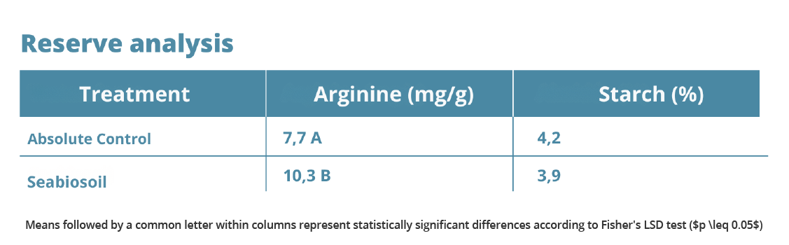 - Arginine and Reserves: SeabioSOIL® applications generate a positive impact on plant metabolism, reflected in the increase of Arginine in the spurs, which rose from 7.7 mg/g to 10.3 mg/g.
