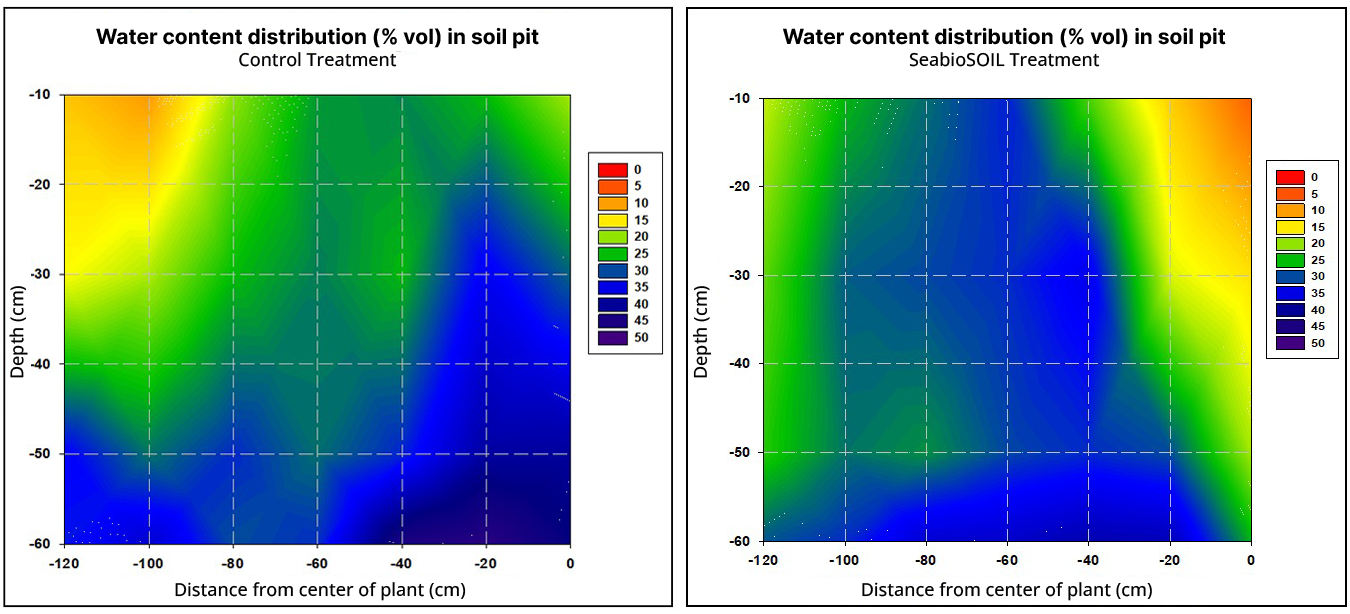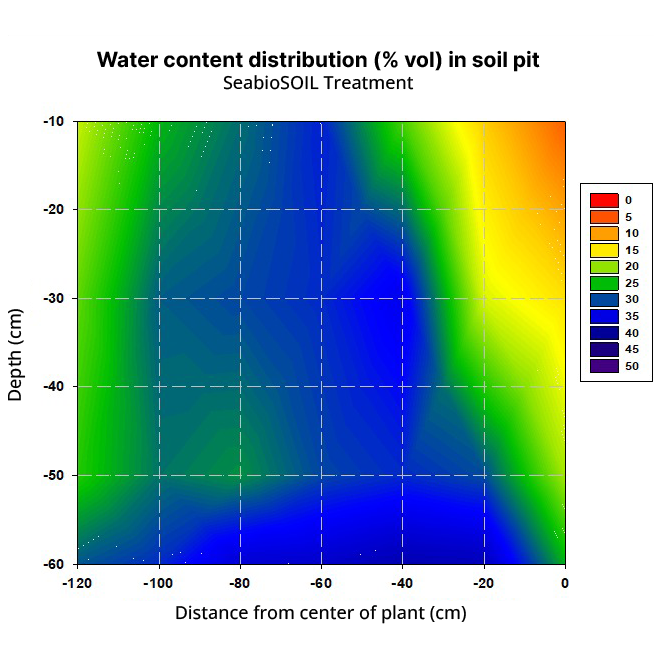 The post-harvest impact of SeabioSOIL® on the physical, chemical, and biological parameters of the soil was evaluated. The trial was conducted on clay-loam soil with high levels of active limestone. Additionally, the site presented an electrical conductivity of 1.7 dS/m due to irrigation water and historical fertilization. Under this restrictive scenario, tree physiology parameters and available soil moisture in the soil profile were EVALUATED.